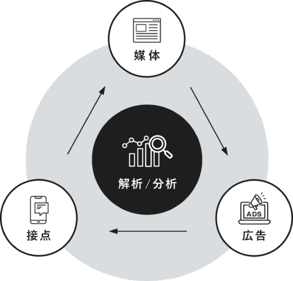 広告運用やサイト解析によるデータの“見える化”から、戦略的なクリエイティブ設計、DX支援や人材育成まで。各領域を横断的に連携させ、短期の成果だけでなく、再現性のある成長サイクルをデザインします。